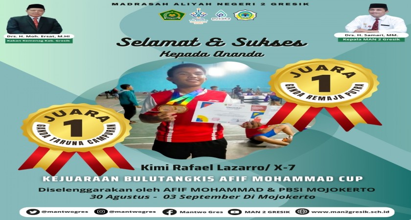 Gresik, 3 September 2023 - Kimi Rafael Lazaro, seorang siswa kelas X-7 di MAN 2 Gresik, telah menorehkan prestasi luar biasa dalam kejuaraan bulutangkis. Kimi berhasil meraih posisi juara 1 dalam nomor bulutangkis tunggal putra, juara 1 dalam nomor bulutangkis ganda remaja putra, dan juara 1 dalam nomor bulutangkis ganda taruna campuran pada Afif Mohammad Cup 2023. Kejuaraan ini diselenggarakan oleh Afif Mohammad dan PBSI Mojokerto, dan berlangsung dari tanggal 30 Agustus hingga 3 September 2023.