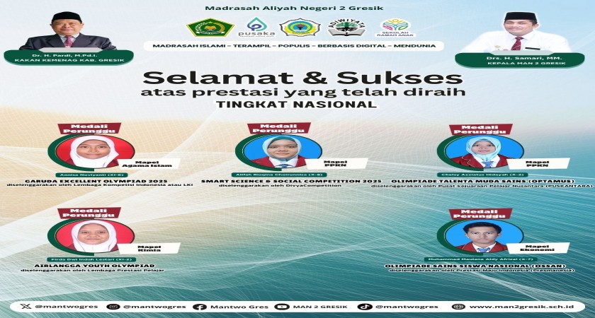 Siswa-siswi MAN 2 Gresik kembali menorehkan prestasi membanggakan di tingkat nasional. Sebanyak lima siswa berhasil meraih Medali Perunggu dalam berbagai kompetisi sains dan sosial yang diselenggarakan oleh lembaga-lembaga bergengsi nasional.