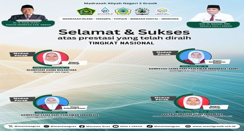 Prestasi membanggakan kembali diraih siswa-siswi MAN 2 Gresik di tingkat nasional. Empat siswa berhasil meraih medali perak dalam berbagai ajang kompetisi sains bergengsi: