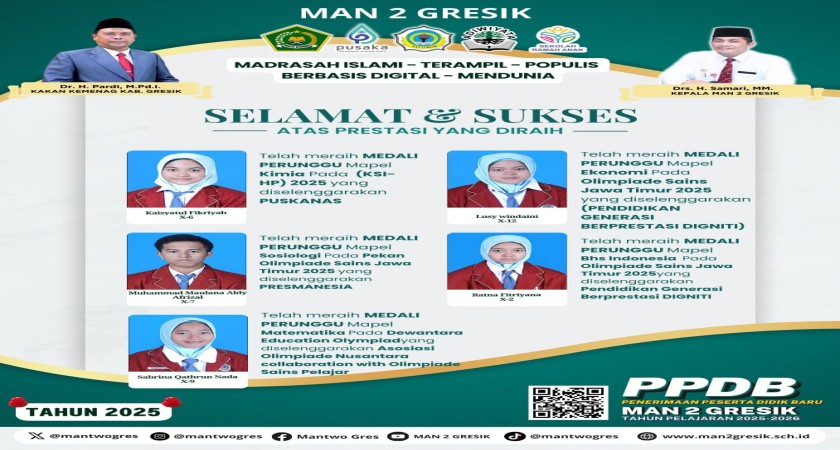 Siswa-siswi MAN 2 Gresik kembali membuktikan kualitas akademiknya dengan meraih Medali Perunggu dalam berbagai ajang kompetisi sains tingkat nasional. Prestasi ini menjadi bukti nyata kerja keras dan ketekunan mereka dalam bidang akademik, sekaligus mengharumkan nama sekolah di kancah nasional.