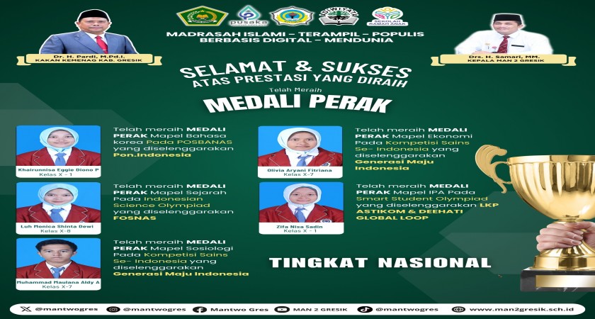 MAN 2 Gresik kembali menorehkan prestasi gemilang di tingkat nasional. Kali ini, lima siswa berbakat berhasil meraih Medali Perak dalam berbagai ajang kompetisi akademik bergengsi yang diikuti oleh peserta dari seluruh Indonesia. Mereka adalah: