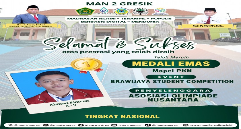 Siswa MAN 2 Gresik kembali menorehkan prestasi gemilang di tingkat nasional. Ahmad Ridwan, siswa kelas X-9, berhasil meraih Medali Emas dalam bidang PKN pada ajang Brawijaya Student Competition (BSC) 2025 yang diselenggarakan oleh Asosiasi Olimpiade Nusantara.