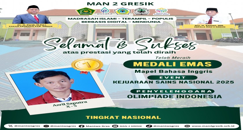 Prestasi gemilang kembali diraih oleh siswa MAN 2 Gresik. Azril Saputra, siswa kelas X-5, sukses meraih Medali Emas dalam bidang Bahasa Inggris pada Kejuaraan Sains Nasional (KSN) 2025, yang diselenggarakan oleh Olimpiade Indonesia (OI).