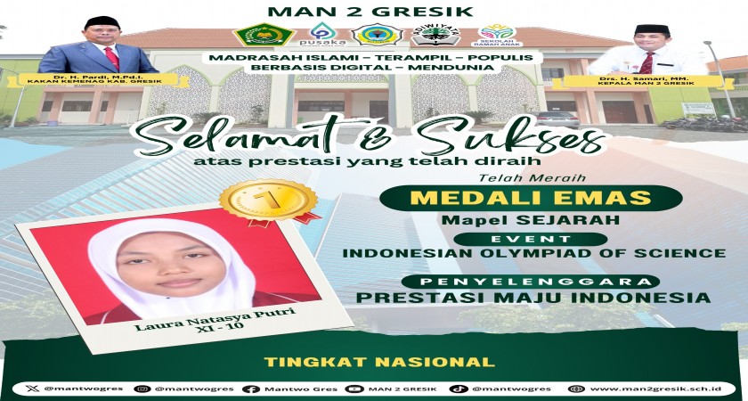 Prestasi gemilang kembali ditorehkan oleh siswa MAN 2 Gresik di kancah nasional. Laura Natasya Putri, siswi kelas XI-10, berhasil meraih Medali Emas dalam bidang Sejarah pada ajang Indonesian Olympiad of Science (IOS) 2025, yang diselenggarakan oleh Prestasi Maju Indonesia (PRESMANESIA).
