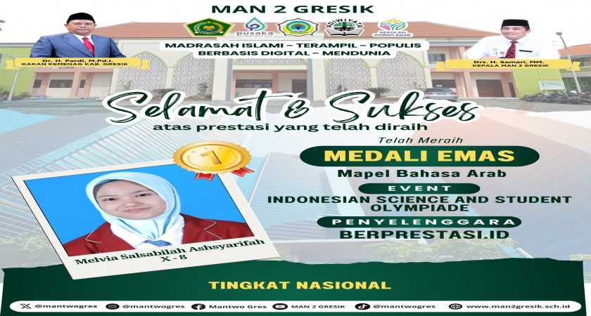 Prestasi luar biasa kembali diraih oleh siswa MAN 2 Gresik di kancah nasional. Melvia Salsabilah Ashsyarifah, siswi kelas X-8, berhasil menyabet Medali Emas dalam bidang Bahasa Arab pada ajang Indonesian Science And Student Olympiad (ISSA) 2025 yang diselenggarakan oleh Berprestasi.id.