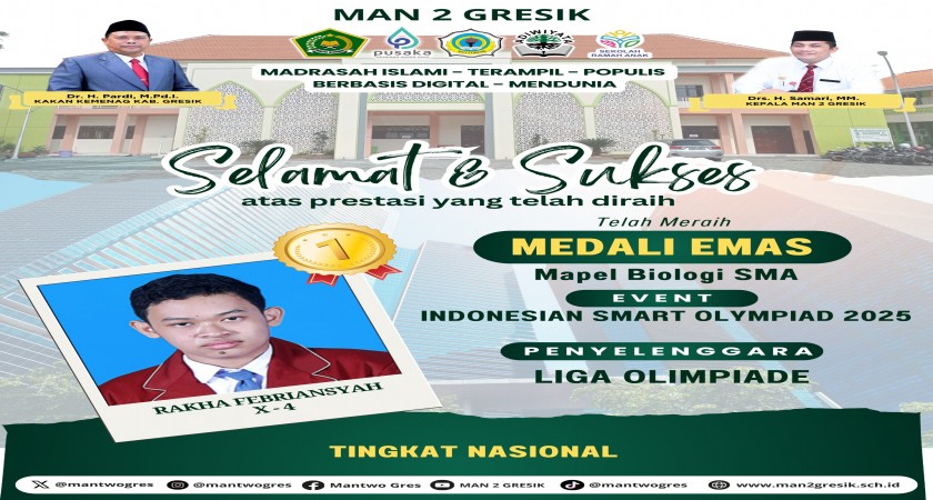 Siswa MAN 2 Gresik kembali mencetak prestasi membanggakan di tingkat nasional! Rakha Febriansyah, siswa kelas X-4, berhasil meraih Medali Emas dalam bidang Biologi pada ajang Indonesian Smart Olympiad 2025 yang diselenggarakan oleh Liga Olimpiade.