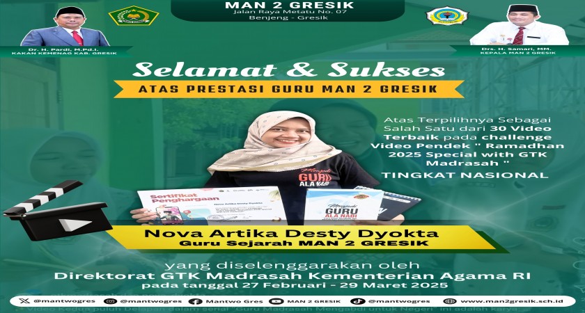 Nova Artika Desty Dyokta, S.Pd., guru Sejarah MAN 2 Gresik, kembali mengukir prestasi di tingkat nasional. Ia berhasil terpilih sebagai salah satu dari 30 video pendek terbaik dalam Challenge Video Pendek Ramadhan 2025 Special with GTK Madrasah, yang diselenggarakan oleh Direktorat GTK Madrasah Kemenag RI pada 27 Februari – 29 Maret 2025.