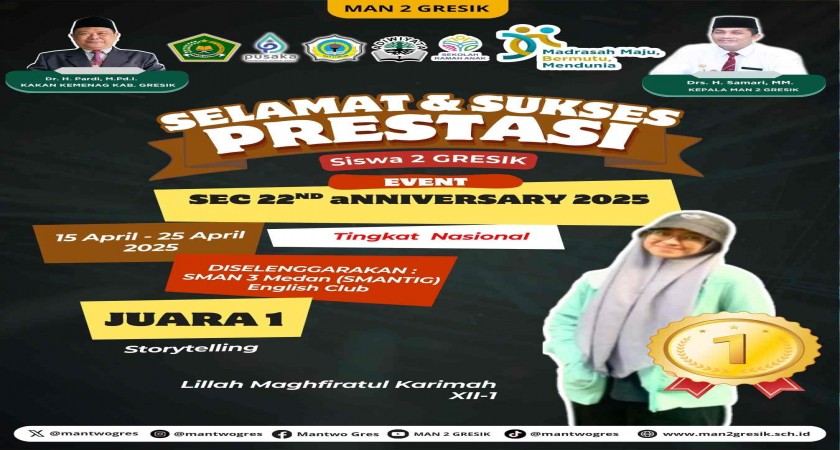 MAN 2 Gresik kembali mengukir prestasi gemilang di kancah nasional. Kali ini, salah satu siswi terbaiknya, Lillah Maghfiratul Karimah dari kelas XII-1, berhasil meraih Juara 1 dalam ajang lomba Storytelling tingkat nasional. Kompetisi ini merupakan bagian dari rangkaian kegiatan SEC 22nd Anniversary 2025 yang diselenggarakan oleh SMAN 3 Medan (SMANTIG) melalui English Club, dan berlangsung pada 15 hingga 25 April 2025.
