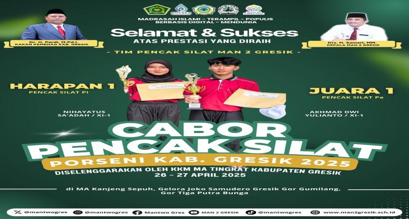 Gresik, 27 April 2025 — Prestasi gemilang kembali diraih siswa-siswi MAN 2 Gresik dalam ajang PORSENI Kabupaten Gresik 2025. Pada cabang olahraga pencak silat, Nihayatus Sa’adah (XI-1) dan Akhmad Dwi Yulianto (XI-1) sukses meraih Juara 1 untuk kategori putri dan putra.