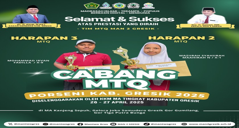 Gresik, 27 April 2025 — Selain cabang olahraga dan MFQ, MAN 2 Gresik juga mencetak prestasi di ajang Musabaqah Tilawatil Qur’an (MTQ) pada Pekan Olahraga dan Seni (PORSENI) Kabupaten Gresik 2025. Dalam kompetisi yang digelar pada 26–27 April 2025 di MA Kanjeng Sepuh, Gelora Joko Samudro Gresik, GOR Gumilang, dan GOR Tiga Putra Bunga, dua wakil MAN 2 Gresik berhasil meraih posisi ‘Harapan’.