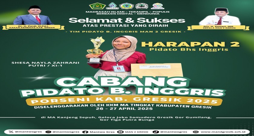 "Prestasi ini menunjukkan bahwa MAN 2 Gresik mampu bersaing, tidak hanya di bidang akademik tetapi juga dalam keterampilan public speaking. Kami berharap Shesa dan siswa lainnya terus mengembangkan bakat mereka," ujarnya.