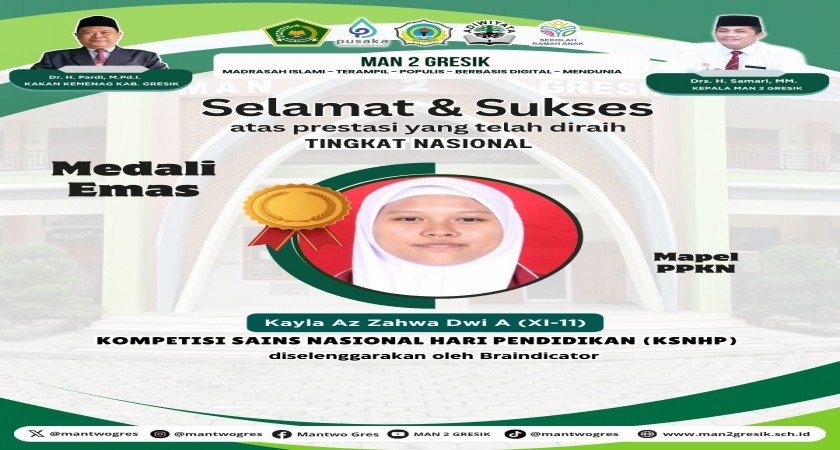 Prestasi kembali ditorehkan oleh siswa MAN 2 Gresik. Kali ini, Kayla Az Zahwa Dwi A, siswa kelas XI-11, sukses meraih Medali Emas dalam ajang Kompetisi Sains Nasional Hari Pendidikan (KSNHP) tahun 2025. Kompetisi ini diselenggarakan oleh Braindicator dan diikuti oleh pelajar dari berbagai penjuru tanah air.