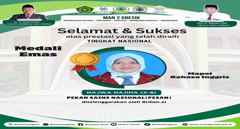 MAN 2 Gresik – MAN 2 Gresik kembali mencatat prestasi gemilang di kancah nasional. Kali ini, Najwa Najiha, siswi kelas XI-6, berhasil meraih Medali Emas dalam bidang Bahasa Inggri