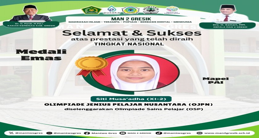 Prestasi membanggakan kembali ditorehkan oleh siswa MAN 2 Gresik. Kali ini datang dari Siti Musa’adha, siswi kelas XI-2, yang berhasil meraih Medali Emas dalam ajang Olimpiade Jenius Pelajar Nusantara (OJPN) 2025. Kompetisi tingkat nasional ini diselenggarakan oleh Olimpiade Sains Pelajar (OSP) dan diikuti oleh peserta dari berbagai sekolah dan madrasah di seluruh Indonesia.