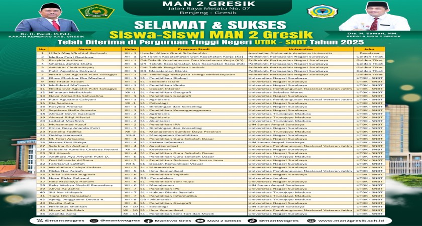 Gresik – Prestasi membanggakan kembali ditorehkan oleh siswa-siswi MAN 2 Gresik. Sebanyak 40 siswa berhasil lolos seleksi masuk Perguruan Tinggi Negeri melalui jalur UTBK-SNBT 2025 dan beasiswa, membuktikan komitmen sekolah dalam mencetak generasi unggul dan berprestasi di bidang akademik.