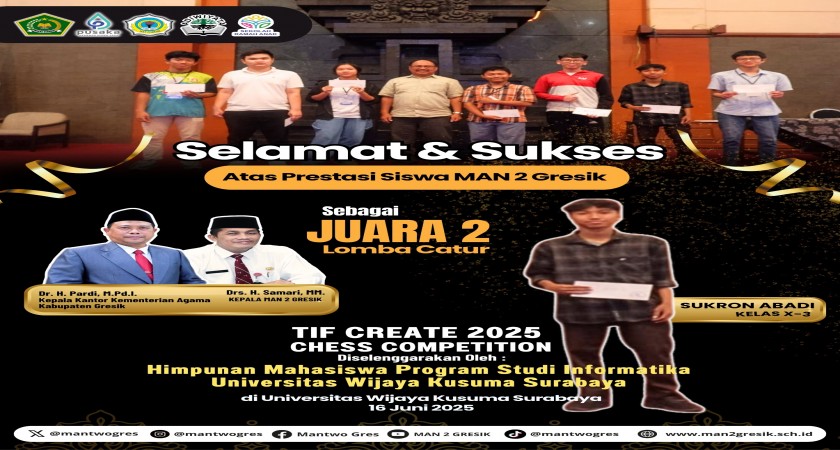 MAN 2 Gresik (19/06) - Satu lagi prestasi membanggakan berhasil diraih oleh siswa MAN 2 Gresik. Sukron Abadi, siswa kelas X-3, sukses meraih Juara 2 dalam ajang TIF CREATE 2025 Chess Competition yang diselenggarakan oleh Himpunan Mahasiswa Program Studi Informatika Universitas Wijaya Kusuma Surabaya pada tanggal 16 Juni 2025.