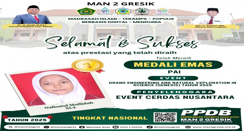 Prestasi membanggakan kembali ditorehkan oleh siswa MAN 2 Gresik. Kali ini, Nafisatul Mufidah, siswa kelas XI-4, berhasil meraih Medali Emas dalam ajang Grand Engineering and Natural Exploration in Science (GENESIS) 2025 pada mata pelajaran Pendidikan Agama Islam (PAI). Kompetisi bergengsi ini diselenggarakan oleh Event Cerdas Nusantara dan diikuti oleh peserta dari berbagai daerah di Indonesia.