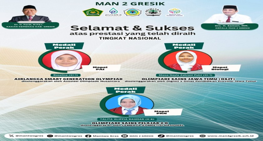 MAN 2 Gresik kembali menorehkan prestasi gemilang di tingkat nasional melalui capaian membanggakan dari tiga siswanya dalam berbagai ajang kompetisi sains. Ketiga siswa tersebut berhasil meraih Medali Perak pada bidang studi yang berbeda, menunjukkan kualitas dan dedikasi luar biasa dalam bidang akademik.