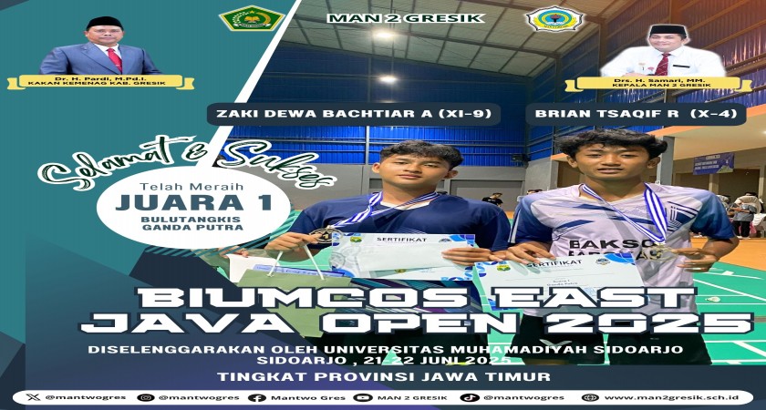 MAN 2 Gresik kembali menorehkan prestasi membanggakan di bidang olahraga. Dua siswa terbaiknya, Zaki Dewa Bachtiar A dari kelas XI-9 dan Brian Tsaqif R dari kelas X-4, berhasil meraih Juara 1 Ganda Putra dalam ajang BIUMCOS East Java Open 2025 yang digelar di Universitas Muhammadiyah Sidoarjo pada 21–22 Juni 2025. Turnamen ini merupakan ajang bergengsi tingkat provinsi Jawa Timur dan diikuti oleh atlet-atlet bulutangkis muda dari berbagai sekolah dan klub ternama di wilayah Jawa Timur.
