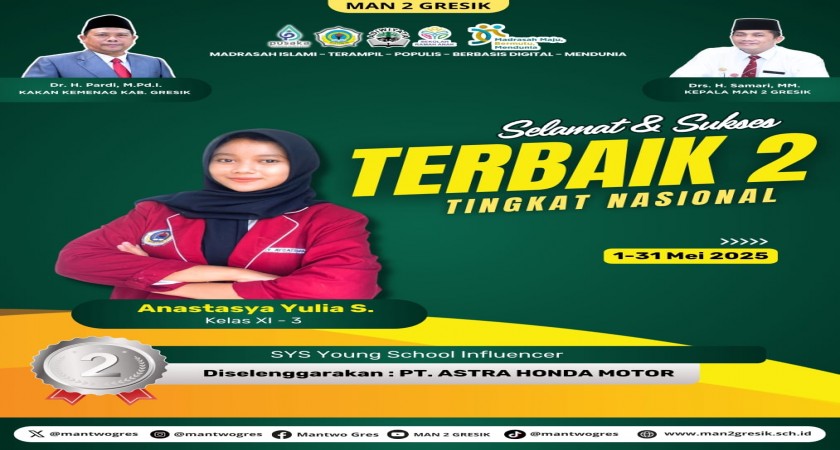 Salah satu siswa terbaik MAN 2 Gresik kembali menorehkan prestasi membanggakan di tingkat nasional. Anastasya Yulia Syaharani, berhasil meraih Predikat Terbaik 2 dalam ajang SYS (School Young Influencer) 2025, sebuah kompetisi prestisius yang diselenggarakan oleh PT. Astra Honda Motor.