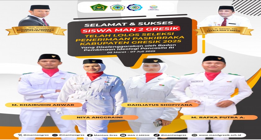 Empat siswa terbaik MAN 2 Gresik berhasil lolos dalam seleksi Pasukan Pengibar Bendera Pusaka (PASKIBRAKA) tingkat Kabupaten Gresik Tahun Anggaran 2025. Seleksi ini diselenggarakan oleh Badan Kesatuan Bangsa dan Politik (Kesbangpol) serta Badan Pembinaan Ideologi Pancasila Kabupaten Gresik yang berlangsung sejak tanggal 5 Maret hingga 7 Juli 2025.