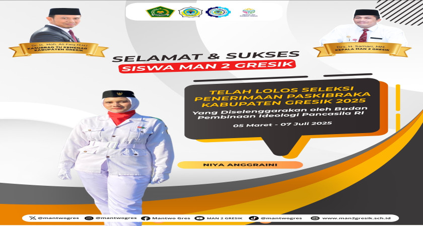 MAN 2 Gresik — Kabar membanggakan datang dari MAN 2 Gresik. Salah satu siswinya, Niya Anggraini, berhasil lolos seleksi sebagai anggota Pasukan Pengibar Bendera Pusaka (Paskibraka) Kabupaten Gresik Tahun Anggaran 2025.