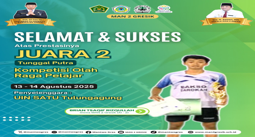 MAN 2 Gresik kembali menorehkan prestasi membanggakan di bidang olahraga. Brian Tsaqif Rizqullah, siswa kelas XI-2, berhasil meraih Juara 2 Tunggal Putra pada Kompetisi Olahraga Pelajar yang diselenggarakan oleh UIN SATU Tulungagung pada 13–14 Agustus 2025.