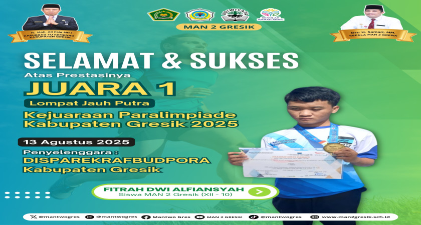 MAN 2 Gresik kembali menorehkan prestasi membanggakan di bidang olahraga. Siswa kelas XII-10, Fitrah Dwi Alfiansyah, berhasil meraih Juara 1 Lompat Jauh Putra pada Kejuaraan Paralimpiade Kabupaten Gresik 2025 yang diselenggarakan pada 13 Agustus 2025.