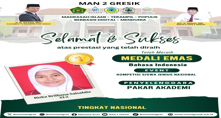 Gresik – Prestasi membanggakan kembali diraih oleh MAN 2 Gresik di kancah nasional. Kali ini, Rizka Brilliana Salsabila, siswi kelas XI-2, sukses meraih Medali Emas dalam bidang Bahasa Indonesia pada ajang Kompetisi Siswa Jenius Nasional yang diselenggarakan oleh Pakar Akademi.