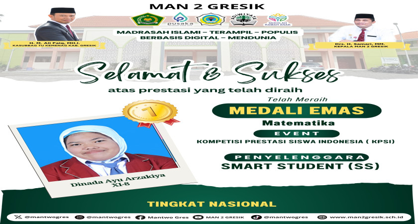 Gresik – Prestasi membanggakan kembali diraih oleh MAN 2 Gresik. Dinada Ayu Arzakiya, siswi kelas XI-8, sukses meraih Medali Emas pada bidang Matematika dalam ajang Kompetisi Prestasi Siswa Indonesia (KPSI) tingkat nasional yang diselenggarakan oleh Smart Student (SS).