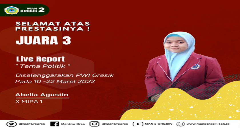 MAN 2 Gresik (22/3). Alhamdulillah,Prestasi kembali ditorehkan oleh siswi MAN 2 Gresik pada bulan maret ini. dia adalah Abelia Agustin, siswi kelas x mipa 1 MAN 2 Gresik. Abelia berhasil meraih juara 3 setelah masuk 10 besar bersaing dengan SMA/MA lain dalam lomba live report yang diadadakan oleh PWI Gresik pada tanggal 10-22 Maret 2022. Tema yang diangkat abel adalah Tema Politik, Debat Calon Ditiadakan, Warga Tambakrejo Geruduk Kantor Kecamatan.