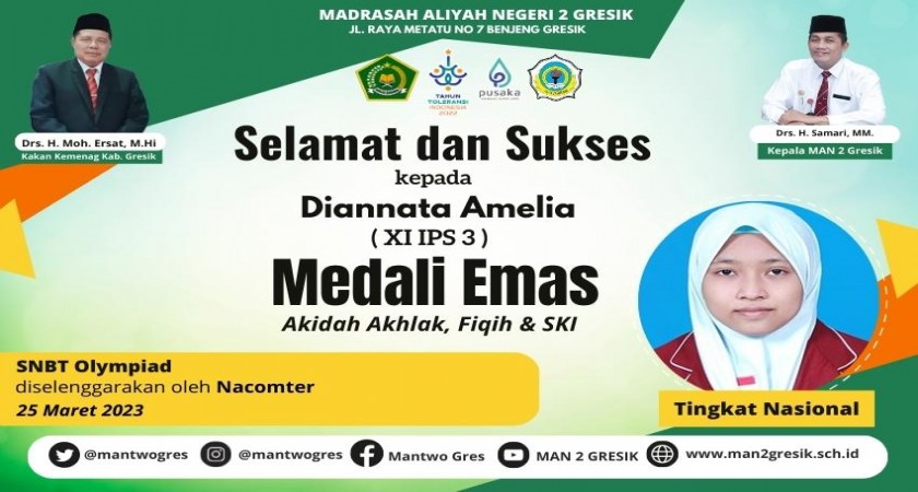 Prestasi kembali ditorehkan oleh siswi MAN 2 Gresik pada ajang olimpiade tingkat nasional. Kali ini, dua siswi dari kelas XI-7 berhasil mengharumkan nama madrasah dengan meraih medali p